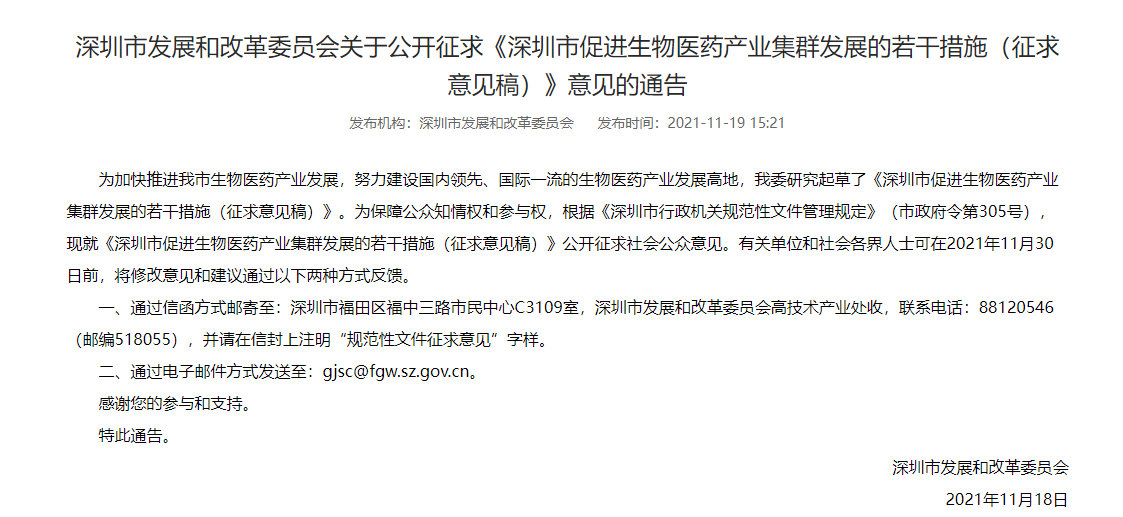 近日,為落實《中共中央 國務院關(guān)于支持深圳建設中國特色社會主義先行示范區(qū)的意見》《深圳市關(guān)于進一步加快發(fā)展戰(zhàn)略性新興產(chǎn)業(yè)的實施方案》(深府〔2018〕84號)等政策精神,充分銜接《深圳市促進生物醫(yī)藥產(chǎn)業(yè)集聚發(fā)展指導意見》及相關(guān)配套文件(深府辦〔2020〕2號),加快推進我市生物醫(yī)藥產(chǎn)業(yè)發(fā)展,努力建設國內(nèi)領(lǐng)先、國際一流的生物醫(yī)藥產(chǎn)業(yè)發(fā)展高地,深圳市發(fā)改委研究起草了《深圳市促進生物醫(yī)藥產(chǎn)業(yè)集群發(fā)展的若干措施(征求意見稿)》。