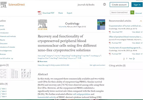 2019年1月,北科生物技術團隊在SCI期刊《Cryobiology》上發(fā)表論文,文章探討不同的凍存液對免疫細胞的冷凍保護效果,旨在開展無血清凍存液的研究項目,血清成分復雜且異源血清易引發(fā)免疫排異反應,因此無血清凍存液能為客戶提供更加安全的免疫細胞儲存和應用。北科生物在細胞制備與儲存的每一個工藝節(jié)點都反復驗證和不斷優(yōu)化,始終堅持用科學承諾質量。