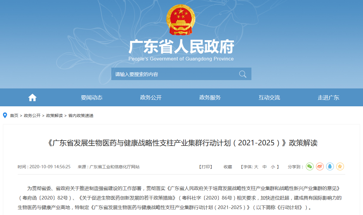 近日,廣東省科學技術廳、發(fā)展和改革委員會、工業(yè)和信息化廳、衛(wèi)生健康委員會、市場監(jiān)督管理局等五部門聯(lián)合發(fā)布《廣東省發(fā)展生物醫(yī)藥與健康戰(zhàn)略性支柱產業(yè)集群行動計劃(2021-2025年)》。